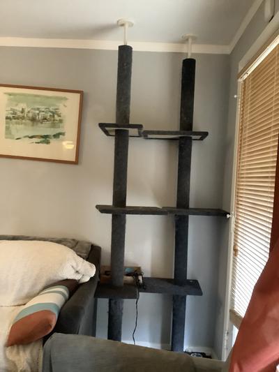 I bought this item because it looked streamlined compared to other cat trees on the market. Assembly was a bit trickier than I'd anticipated because a cut needs to be made in a piece of PVC tube to get a tight fit to the ceiling. I am happy with the minimal space required and my cats like to window watch from it, though it is challenging for them to climb from one shelf to another and they don't find it comfortable for napping. It also is a bit shaky which seems to bother me more than the cats. All in all it was a good buy.